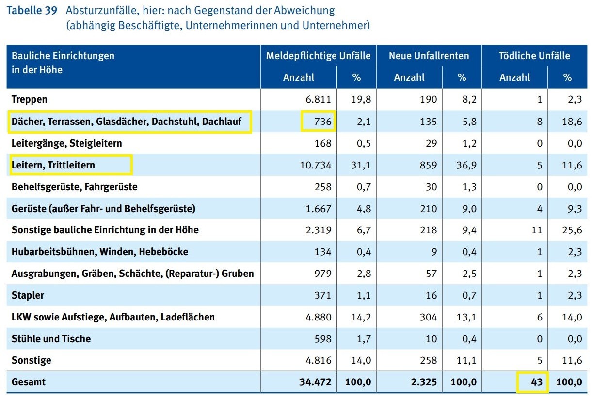 Absturz Unfälle 2021 DGUV Statistik Tabelle